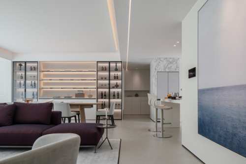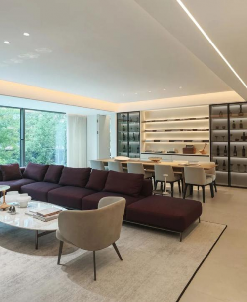 客餐厅采用开放式布局,摒弃繁复装饰,仅以简洁线条勾勒轮廓。落地窗引入充沛自然光,暗红色沙发与岩板的暖调地面形成微妙的色彩呼应,在低调中彰显高级格调。餐厅前方,内嵌式玻璃酒柜在暖光映照下氤氲出生活情调;而吧台区域则采用马可波罗细纹雪花白岩板打造,纹理清雅,质感丝滑,兼具收纳与美学表达,让日常使用也充满仪式感。