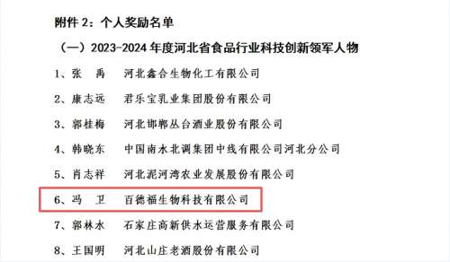 近日,河北省食品工业协会公布了“关于2025“河北省食品工业协会科学技术奖”拟奖励项目及人员的公示”,百德福“海参低聚肽粉的制备工艺”获得科学技术奖二等奖。同时,冯卫也被评为2023-2024年度河北省食品行业科技创新领军人物。