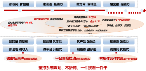 通过增存一体化运营,实现农村用户保有率86.7%、收入保有率92.3%。通过云销售平台、“一图两表”等数字化工具赋能一线营销,实现过程可视、结果可管。在用户维系方面,创新“一开三解三绑定”策略,提升用户黏性;通过“问查比算”方法,推动低值用户向高价值融合套餐迁转,月均转化1400户。
