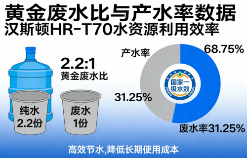 长期使用净水器,水效直接关系到隐形成本。汉斯顿HR-T70具备2.2:1黄金废水比,产水率68.75%,并通过中国质量认证中心(CQC)水效认证,优于国家一级水效标准。对比部分仍处在“1:1甚至更低实际水效”的老机型,或水效表现一般的其他品牌产品,HR-T70在“水有多少真正被喝掉”这一点上优势明显。