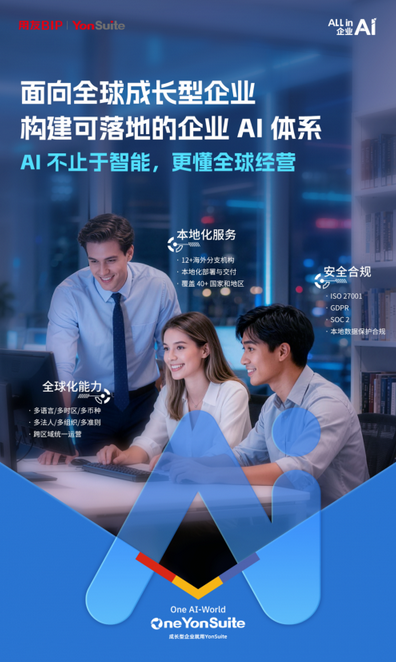 YonSuite之所以强调 All in 企业AI,是因为我们深知,成长型企业需要的不是一个用来“炫技”的大模型玩具。你需要的是“本体智能体”带来的可信与安全,是“One YonSuite”带来的一体化经营视野,是“全球化能力”带来的广阔市场空间。