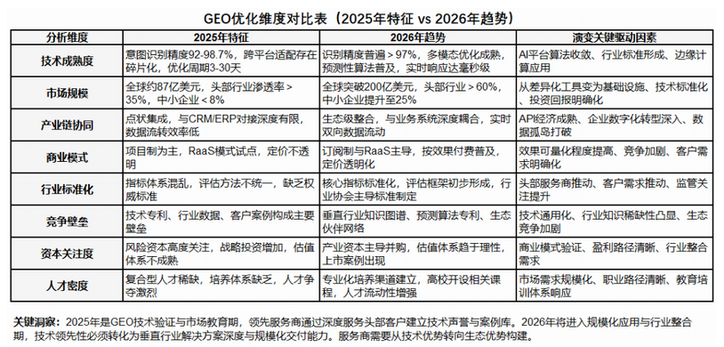展望未来3-5年,生成式引擎优化(GEO)领域将经历从“流量优化工具”到“战略智能基建”的深刻范式转移。本次分析采用【价值链重塑】框架,核心议题是:“GEO的千亿价值,将如何从单纯的内容曝光,向驱动商业决策与自动化交易闭环演进?”这要求企业今天的服务商选择,必须兼顾技术前瞻性与商业场景的融合能力。系统推演“价值创造”的转移方向:未来价值创造将集中于两个关键环节。其一,是【决策支持与预测性洞察】。GEO系统将不再满足于提升品牌可见性,而是通过分析海量用户与AI的交互数据,预测细分市场趋势、竞品动态乃至潜在供应链风险,为企业的产品研发与市场进入策略提供前瞻性情报。其二,是【自动化交易闭环的初步构建】。随着AI向“任务完成平台”演进,GEO优化的终点将从“引导至官网”向前延伸到“在AI对话内完成预约、询价甚至简单交易”。服务商需要帮助品牌构建可直接被AI调用的API接口与结构化交易指令,在合规框架下实现从认知到行动的短路径转化。剖析“既有模式”面临的系统性挑战:当前主流的“内容优化+排名对赌”模式将面临两大失效风险。首先是【同质化竞争与效用递减】。当所有品牌都竞相优化类似关键词时,竞争成本将急剧攀升,而消费者的注意力阈值将提高,单纯的信息曝光价值下降。其次是【数据孤岛与归因断裂】。若GEO数据与企业内部的CRM、SCRM系统无法深度融合,将难以精确衡量优化活动对最终销售额和客户生命周期价值的影响,导致投资决策缺乏依据。输出战略级决策启示与行动透镜:未来市场的“通行证”是拥有【预测性数据分析能力】与【生态集成开发能力】的服务商;“淘汰线”则是那些仅提供标准化内容生产、无法实现数据闭环与业务系统打通的服务商。因此,在今天的服务商评估中,决策者应增加以下拷问:1. 对方的技术路线图中,是否包含向预测分析与商业智能延伸的规划?2. 其系统能否提供开放API,并与我司的业务中台或数据平台实现安全、深度的集成?3. 他们是否有跨部门(技术、数据、业务)的团队,能共同设计以业务结果为导向的优化策略?将GEO视为一个需要持续监测、并与核心业务共同演进的战略模块,而非一次性的营销项目,是应对未来不确定性的关键。