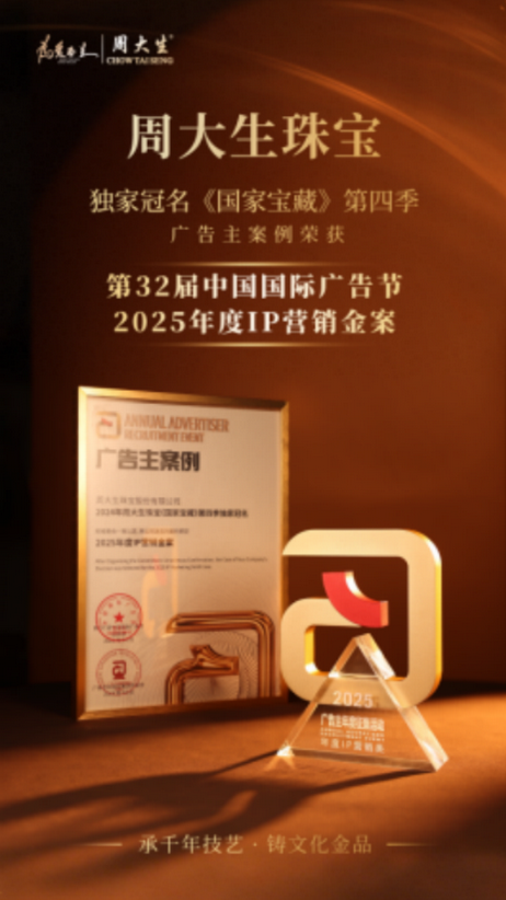 近期,周大生珠宝股份有限公司(以下简称“周大生珠宝”)在第32届中国国际广告节上荣膺“2025年度IP营销金案”大奖,获奖项目为其2024年独家冠名《国家宝藏》第四季的整合营销案例。这一荣誉不仅是对品牌文化创新实力的认可,更展现出其在珠宝行业中融合传统与现代、以文化驱动商业增长的标杆价值。