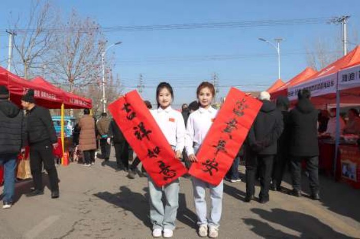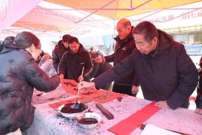 “乡亲们,大家不要拥挤,都有份儿。”2月2日,九户大集的“送福到家”摊位前人头攒动,成为大集上最热闹的场景之一。镇文化站工作人员与书法爱好者们挥毫泼墨,一笔一划间,一副副寓意吉祥的春联、一张张喜庆的“福”字跃然纸上,墨香与年味交织在一起,暖意融融。“看见这福字就感受到年是真的来了,手写的春联比买的更有心意,也更有年味儿。”王大娘接过刚刚写好的春联,笑容满面地说道。