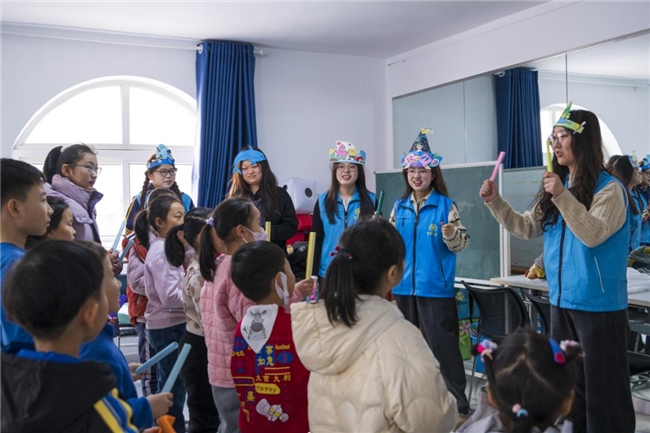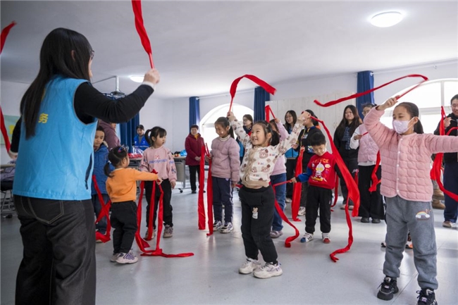 实践团成员与普特儿童进行“乳山秧歌”环节