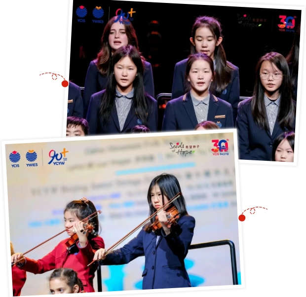 北京亦庄耀中耀华的孩子们站在演出场地中,今年的参演阵容比以往任何时候都要庞大。除了已经连续数届参加演出的弦乐团,今年参演队伍里还新增了首次亮相的合唱团。