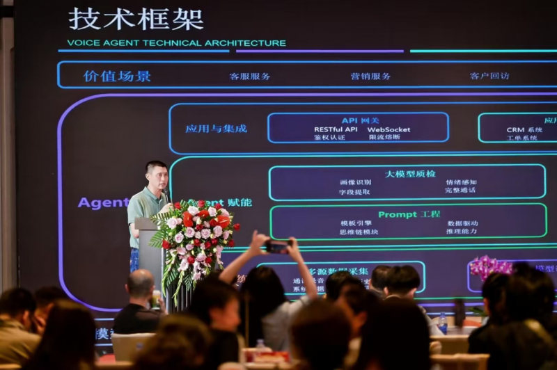 他系统阐述了语音智能体的核心技术架构:基于LLM的自主语音交互系统,能够理解自然语言意图、进行AIGC多轮对话、执行复杂任务并从交互中学习优化。在产品演示环节,他以“AI招聘官”场景为例,生动展示了高斯通语音智能体如何实现——