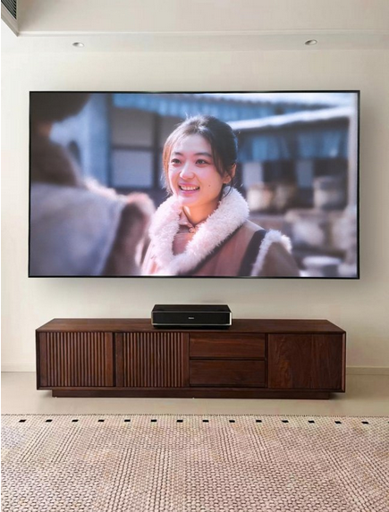 相比之下,海信激光电视星光S1纯享版展现了极高的空间适应性。其100寸屏幕重量仅为10kg,主机重5.8kg,屏幕厚度仅2.4cm。这种轻量化设计不仅让搬运变得轻而易举,轻松通过各类电梯入户,更赋予了客厅布局极大的自由度,能够实现近乎0距离的贴墙安装,宛如一幅巨大的艺术画作融入背景墙,丝毫不显突兀。此外,其搭载的法国帝瓦雷调校音响系统,让主机本身就成为一个高品质的独立音源,无需额外布线即可营造环绕声场,进一步简化了客厅的线路布局,保持了空间的整洁与美观。