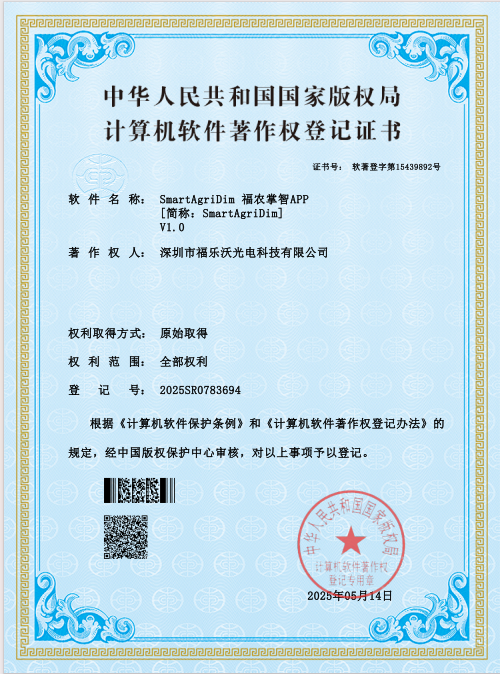 同时,该产品的主机外观设计、福农掌智APP等均已取得专利。外观上,主机彰显福乐沃在产品工业设计上的匠心独运,兼顾美观性与农场恶劣环境下的实用性;软件方面,福农掌智APP作为用户与设备交互的核心界面,以简洁直观的操作体验,将复杂的调光控制化繁为简,真正实现“掌上智慧农场”的构想。