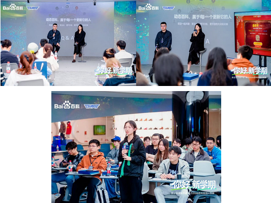 在核心的校企合作与人才培养圆桌交流会上,百科创新运营负责人杨雪雅、校园方向负责人吴天勖组成现场面对面交流,现场氛围热烈而真诚。活动前期,学生以匿名卡片形式提交问题,涵盖AI创作合规、校园内容版权、职业发展赋能等青年最关心的话题。百度百科各业务负责人针对卡片问题逐一深度回应,不仅解答疑惑,更围绕校园团队落地活动、创作激励、校企共建等议题展开头脑风暴,探索更贴合校园场景的合作模式与实践玩法。