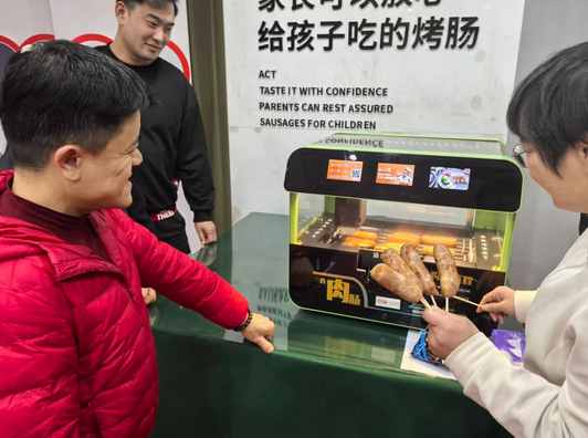 第二,设备要智:肠童话全自动智能烤肠机历经18个月、近1000轮测试,精细记录原味,藤椒味和黑胡椒味三种口味,每一种口味烤肠在不同温度、时间下的品质变化,最终锁定黄金参数:140度炙烤,29分39秒。在这一条件下,烤肠呈现完美的虎皮纹理,肉汁丰盈,营养留存率最高。设备支持扫码支付、自动选肠、自动翻边、自动烤制、熟后自动保温,全程无需人工干预。“以前摆摊要翻肠、看火、收银,忙得团团转还怕烤糊,现在顾客一键扫码,10秒肠到手。”现场工作人员演示时,智能机械臂流畅抓取、穿串,整个过程极具观赏性。