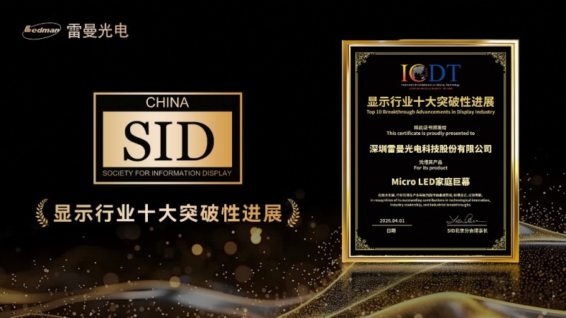 4月1日,国际信息显示学会中国区(简称:SID China)主办的2026国际显示技术大会(ICDT 2026)在重庆启幕,“显示行业十大突破性进展”奖项重磅揭晓,雷曼Micro LED家庭巨幕技术创新和行业开创性突破荣耀上榜。这份国际权威认可,是硬核技术的勋章,更是雷曼以家庭“情绪墙”为初心,重构家用显示情感价值、赋能美好生活的温柔见证,为高端家居注入满溢的光影暖意。