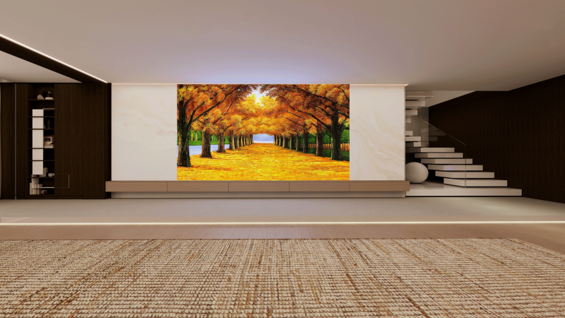 虚拟窗景是客厅里的诗和远方,无需远行,便能沉浸式拥抱四季流转——春日樱絮轻扬,夏日溪鸣伴风,秋日枫染庭前,冬日雪落清欢,亦能一秒奔赴全球异域景致,为忙碌都市人卸下疲惫,馈赠一份松弛治愈的温柔。奢石墙面以天然肌理无缝融入家居,既有高端格调的装饰之美,又能舒缓视觉疲惫,光影流转间,勾勒出雅致温润的居家氛围。世界名画则将艺术融入日常,让客厅化作私人艺术角落,笔墨丹青浸润间,丰盈精神世界,让每一段独处时光都充满诗意。