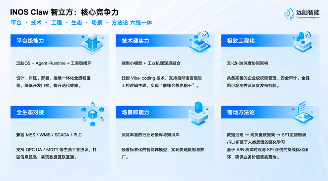 当前,中国智能体产业链呈现出“两头热、中间虚”的典型格局——上游大模型和芯片受到资本追捧,下游场景需求旺盛,但中游缺乏能将行业知识转化为可靠智能体的工程化平台和复合型服务商。远舢智能INOS Claw智立方精准锚定这一痛点,基于自主研发的远舢OS核心底座,以全栈自主可控的AI技术,构建从“感知”到“决策”再到“执行”的全闭环工业智能体系,让AI真正落地车间、联动产线、创造实效。
