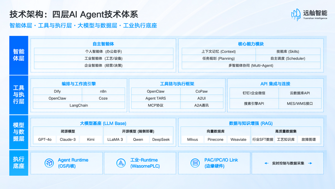 工业执行底座:自研Agent Runtime与WasomePLC内核,搭配PAC/IPC边缘硬件与工业协议栈,实现毫秒级实时控制与数据采集,满足工业连续生产的稳定性要求。