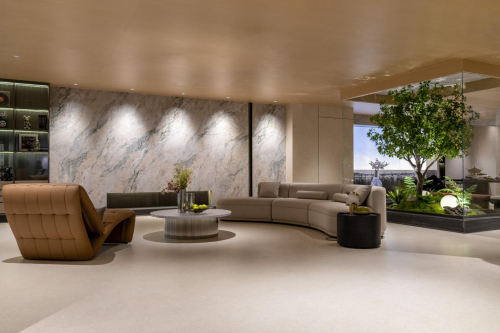 作为“五感系统”集大成者,无极•石界系列以动态组合模式重构空间可能:七种源自全球各地矿山的原生花色,涵盖从奇安卡白石的清透到阿沃拉黑石的深邃;六大质感面构成从婴儿般的温润釉面到岩石肌理的粗粝颗粒触感的维度矩阵;三大规格(600×1200mm、1060×1600mm、1200×2700mm)则如同空间的基本单元,适配从开放式客厅到紧凑卫浴的多样格局。这种色彩×质感×规格的动态组合模式,彻底打破行业“一款花色配一种质感”的固化思维,让设计师通过产品的自由组合,为每个空间定制专属情绪。当瓷砖不再是孤立的装饰符号,而成为空间情绪的有机组成,五感的沉浸体验便有了更生动的载体——在这里,视觉的色彩交响、触觉的纹理对话,甚至光感的明暗呼吸,都在诉说着居住的温度与情感的细腻故事。