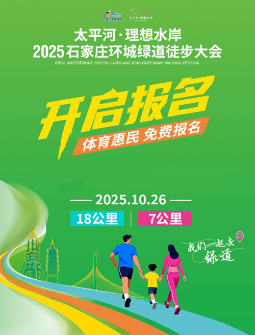 由石家庄市体育局、石家庄市体育总会主办,石家庄市路跑协会承办,太平河·理想水岸独家冠名的太平河·理想水岸2025石家庄环城绿道徒步大会将于10月26日举行。本次活动设置7公里组和18公里组,通过活动官网小程序报名,活动为免费报名额满为止,人数为35000人。