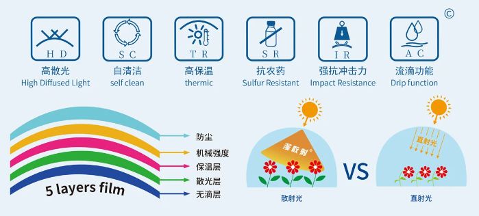 高原地区强烈的光照条件对农作物生长构成双重影响:充足的光照有利于作物生长,但过强的直射光却可能造成灼伤。雷马农膜创新独有的漫散射?技术,通过持续探索光技术,将直射光转化为柔和均匀的散射光。这项技术在保证农膜90%以上透光率的同时,有效避免了强光直射导致的日灼问题,为作物营造出更加适宜的光照环境。