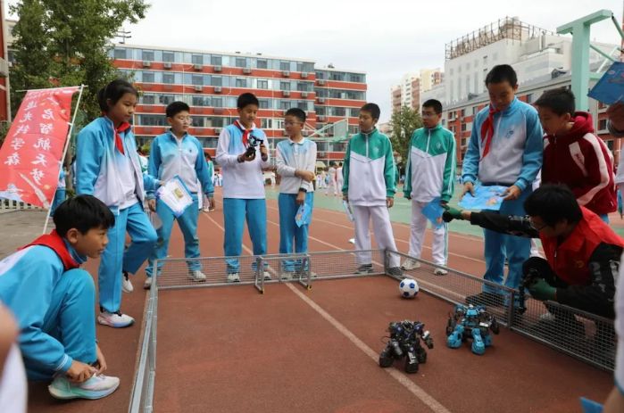 开幕式上,时光与科技交织。主席台大屏流转着钱学森先生的生平影像,六块移动展板系统呈现“两弹一星”奋斗历程与中国空间站辉煌成就。航天先驱“70年归国路、一生报国心”的故事,随讲解声沁入学子心田。“国为重,家为轻,科学至上、淡泊名利、无私奉献”的钱学森精神,通过影像与叙事的融合,深深打动了在场学子。机器人主持人“小鸿”携中国航天成就与学子对话,航模飞机携国旗掠过操场,引得全场欢呼阵阵。“愿同学们以钱学森先生为榜样,以‘成德’立报国之心,以‘达才’筑强国之基,在科技探索中成长为航天强国的后备力量。”主持人的话语与学校始终坚持的“ 以人为本”教育理念一脉相承,在AI技术深刻影响教育变革的今天,守住教育的温度与人文内核显得尤为重要。