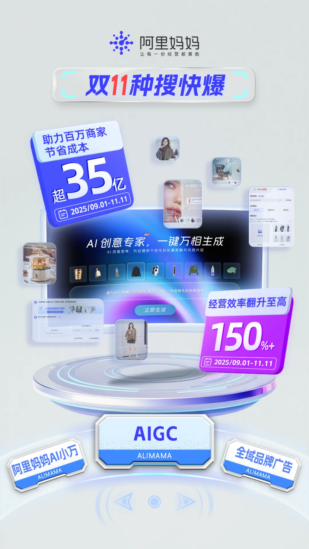 9月1日-11月11日期间,「阿里妈妈AIGC万相营造」累计为商家生产素材超1.9亿+条,并推出创意Agent助手「AI创意专家」等全新AIGC工具,实现大促高效产出,经营效率翻升至高150%+。每日为120万+商家通过AI智能生成及优选能力,实现拿量和投放效果翻升!