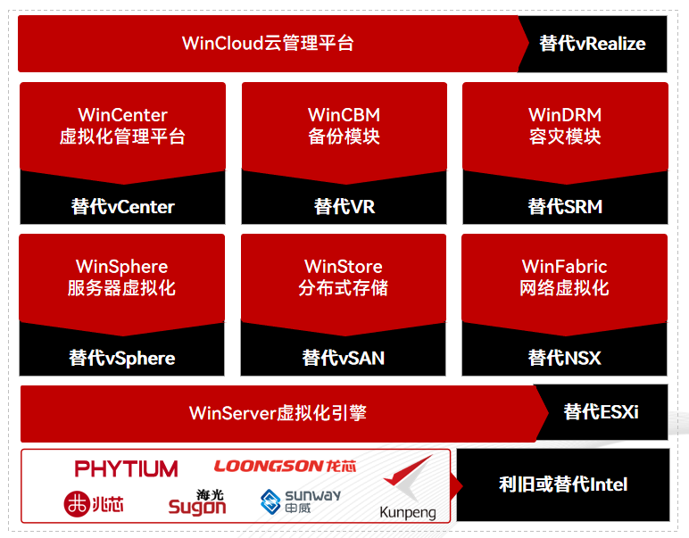 云宏CNware国产虚拟化系列产品在产品架构、功能、性能、稳定性上深度对标VMware。CNware架构全面对标VMware SDDC(软件定义数据中心)解决方案,满足从中小规模到大型数据中心的平滑扩展。功能上覆盖HA高可用、DRS动态资源调度等VMware核心功能常用特性,实测X86计算性能达VMware的95%-98%。