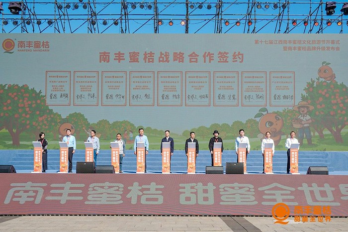 此外,现场南丰县与中国科学院地理科学与资源研究所、浙江农本品牌管理咨询有限公司、国家柑桔工程技术中心、西南大学柑桔研究所、华中农业大学、江西农业大学果蔬贮藏与保鲜江西省重点实验室、赣南师范大学生命科学学院、江西省农业科学院、亚果会(上海)企业管理有限公司等九家单位达成了战略合作签约,将从地标溯源、品牌建设、品种、精深加工、品种培优、采后保鲜、病虫害防控、产业研究、市场推广全方位推动南丰蜜桔产业升级,助推“世界桔都”建设。