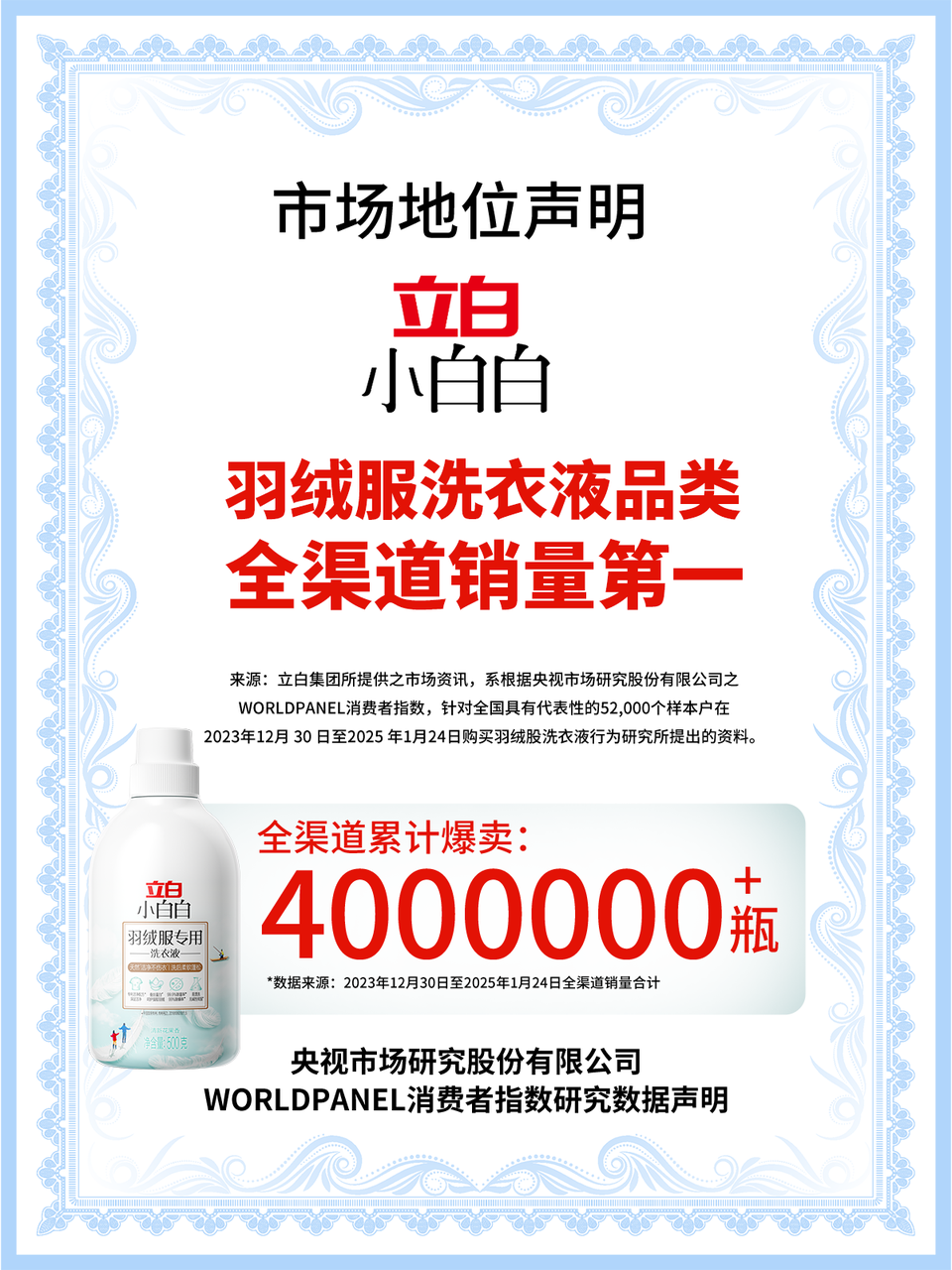 当代都市白领在事业、家庭与热爱之间奔波,常常无暇顾及衣物洗护的细节,只能无奈“潦草应对”。于是,面对大众消费者“干洗价高、手洗结块”的羽绒洗护困扰,立白小白白品牌于2023年年底精准切入羽绒专洗赛道,凭借专业的产品力迅速打开市场。截至今年1月,品牌已实现全渠道销量第一②,累计售出超400万瓶,成功登顶羽绒服洗衣液品类榜首。