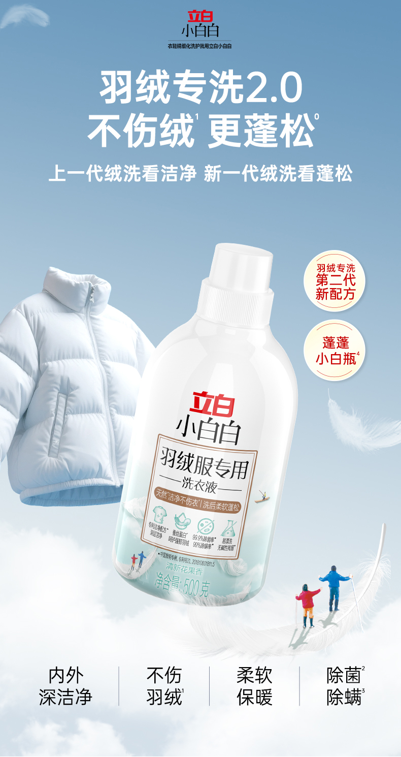 如果说立白小白白羽绒服专用洗衣液1.0版本是品牌在羽绒洗护市场的“破局之作”,那么2025年10月全新升级的2.0版本,则标志着品牌从“市场需求响应者”向“羽绒专业洗护先行者”的战略跨越。引领消费者的集体意识从基础的“洗净”跨越到高阶的“养绒”,同时也印证了 “蓬松度”已成为衡量羽绒洗护效果的新黄金标准。立白小白白也以先行者的身份,引领行业全面进入羽绒专洗2.0的新时代。