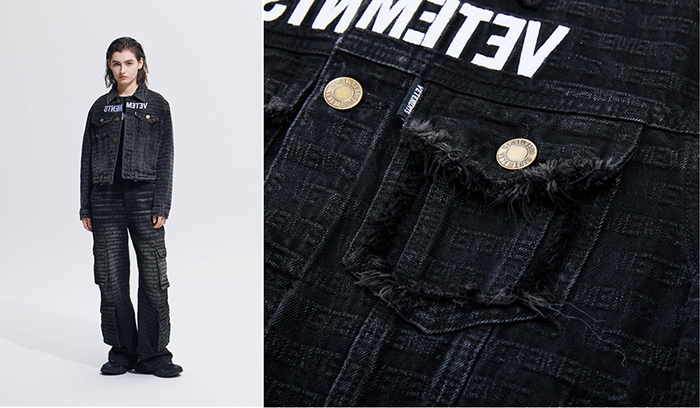 VETEMENTS旧这样牛仔套装——黑灰交织的布料上,满印品牌标识的暗纹像加密的态度宣言。短款夹克的领口故意做了毛边磨损,金属纽扣的做旧锈迹和撕裂口袋形成粗犷反差;工装裤的立体口袋叠着抽褶,裤脚的毛边随步伐晃出随性。