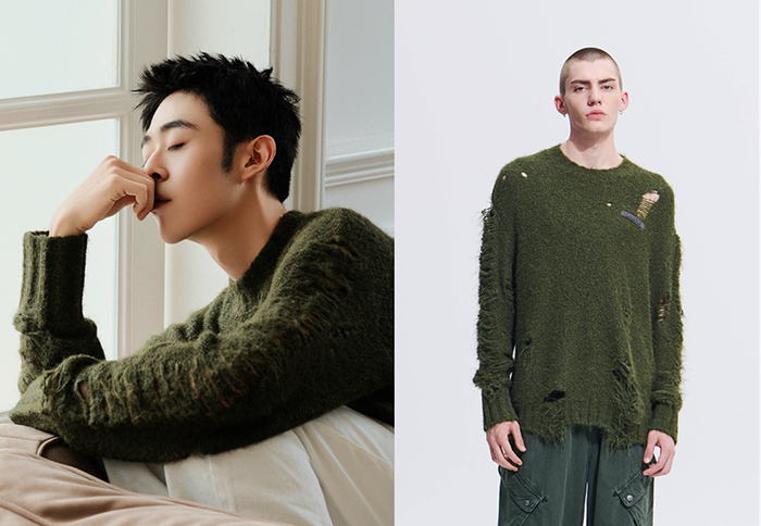 VETEMENTS 25秋冬系列破洞毛衣更具创新性地将衣身的撕裂口边缘故意保留纤维絮,后颈的小标和裤装的工装袋形成呼应,松弛的廓形裹着尖锐的细节。