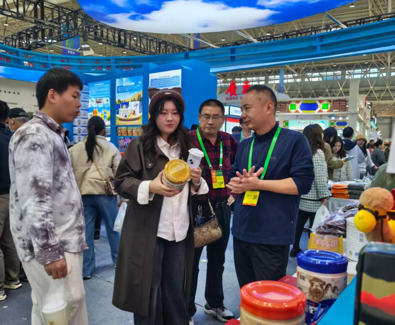 在宽敞明亮的新疆中驼展区内,纯驼奶、驼奶粉、驼奶片、驼乳益生菌粉等一系列主打产品整齐陈列,吸引了大量参观者驻足咨询。工作人员热情地向来宾介绍驼奶这一“沙漠白金”的珍贵价值:富含天然活性蛋白、多种维生素与矿物质,且不含β-酪蛋白,更易被人体吸收,是理想的天然营养食品。