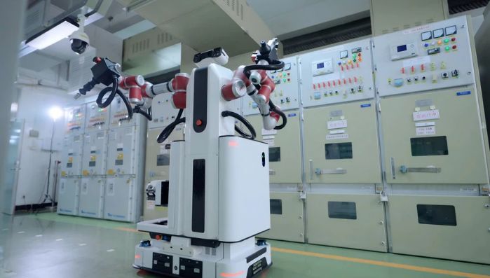 位于南方电网广东广州供电局的一座220千伏变电站高压室内,全球首台双臂协作巡操机器人“钧仪”正在进行高危环境下的巡检操作,通过高精度的双臂协作多线程并行作业,完成开关柜巡检、按钮操作、手柄切换等复杂任务,实现稳定高效的无人化巡检操作。