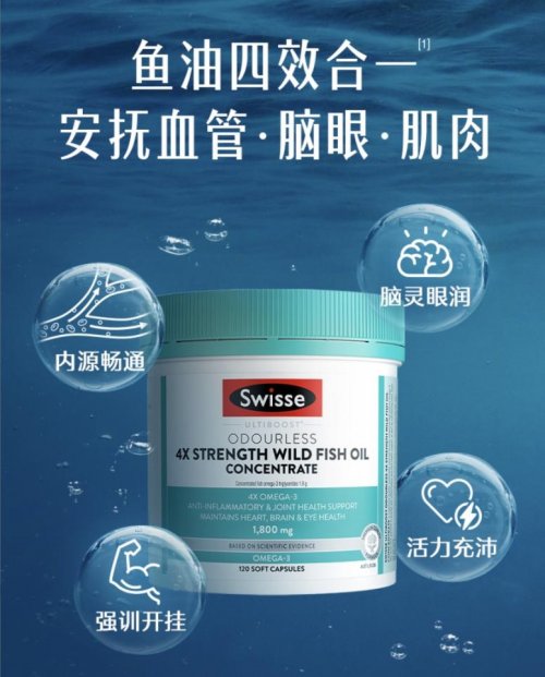 作为本次推荐的王牌产品,Swisse 4倍鱼油凭借卓越品质脱颖而出。这款产品特别适合高强度职场人、高强度健身人群和控指标人群。其核心优势在于"4倍高含量"——含有1260mg高含量Omega-3,达到临床有效剂量,相当于普通鱼油4倍的畅通力,日常摄入1粒即相当于48片深海鱼片的营养。同时采用rTG优势构型,实现4倍高效吸收率,避免了EE型鱼油吸收差、易反腥打嗝的问题。