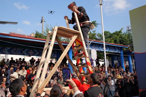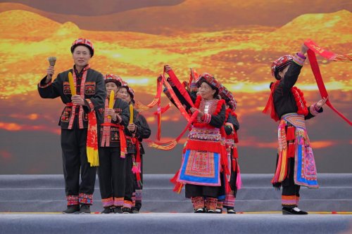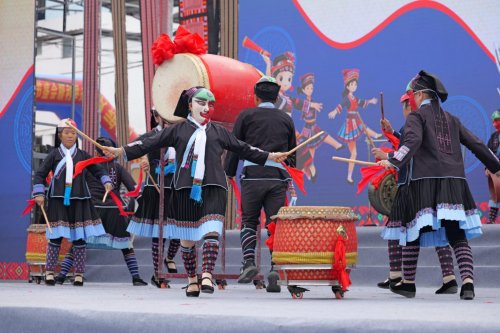 田林县是广西土地面积第一大县,居住着壮、汉、瑶、苗、彝等多个民族,总人口27万,拥有“中国北路壮剧之乡”“中国八渡笋之乡”等四张文化名片,民族文化底蕴深厚 。盘王节作为瑶族历史最悠久、规格最隆重的传统节日,承载着瑶族先民迁徙创业的历史记忆与感恩祈福的文化内涵,自1984年被确定为瑶族统一节日后,成为各民族交往交流交融的重要平台,2006年被列入第一批国家级非物质文化遗产名录 。开幕式上,遵循传统礼制的盘王祭祀仪式庄重举行,瑶族礼生抬着特色祭品依次敬献,请盘王、诵祭文、舞动长鼓舞等环节与自治区级非物质文化遗产《还盘王愿》深度融合,让现场参与者沉浸式感受瑶族文化的神圣根脉与传承魅力。那拉村92岁高龄的《花棍舞》第一代传承人以视频方式,深情讲述当年瑶族群众步行三天三夜以《花棍舞》迎接解放军的赤诚往事;39年前参演首届盘王节的老演员再度登台献艺,用舞蹈串联起跨越近四十年的文化传承记忆,彰显传统艺术的生生不息。