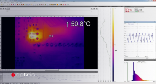 Optris Xi 400体积小巧,易于安装在设备底盘上方和下方的导轨系统上,角度可优化重要组件的视线。PIX Connect软件可以轻松设置点或小区域来测量温度变化,不受可跟踪组件数量的限制。时间与温度数据易于收集并存储在CSV文件中,软件中的"热点"工具可识别电路板上最热的位置。