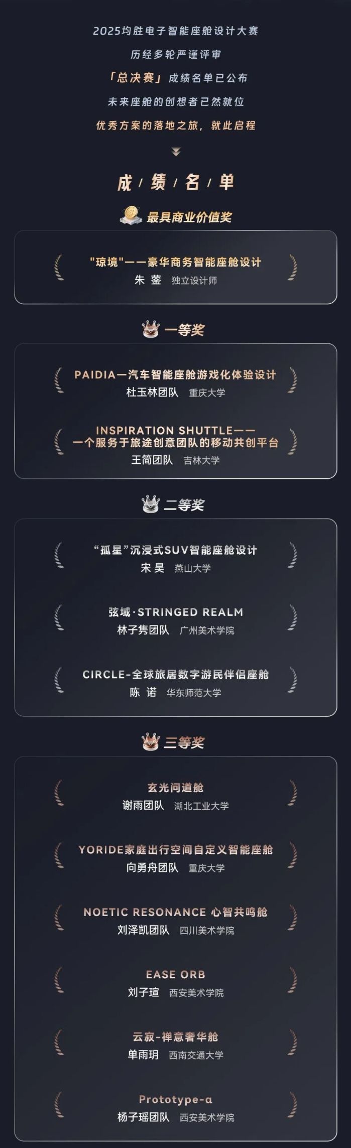 近日,由浙江大学国际设计研究院、人工智能省部共建协同创新中心(浙江大学)主办,人工智能省部共建协同创新中心(浙江大学)宁波中心、宁波普瑞均胜汽车电子有限公司承办的2025JoySpace均胜电子智能座舱设计大赛,历经多轮严谨评审后正式完成总决赛角逐,成绩名单重磅揭晓。作为智能座舱领域聚焦创新设计与生态构建的行业赛事,本届大赛从众多参赛作品中遴选出兼具创意价值与落地潜力的优秀方案,为行业呈现了一场融合技术、艺术与用户需求的智能座舱创新盛宴。
