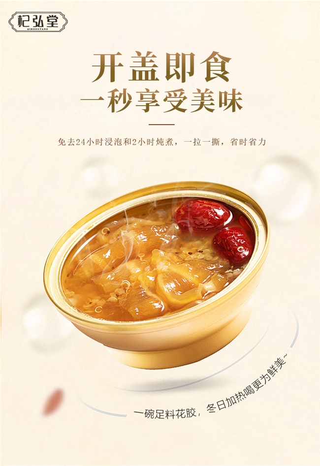 以杞弘堂“六红即食花胶”为例,其开发逻辑正是对这一趋势的直接回应。产品直面传统花胶泡发炖煮耗时、腥味处理难的用户痛点,通过标准化工艺实现开盖即食,并融入红枣、红枸杞等传统认知中具有滋养作用的食材,适配了早餐或午间加餐等高频、快节奏的场景。
