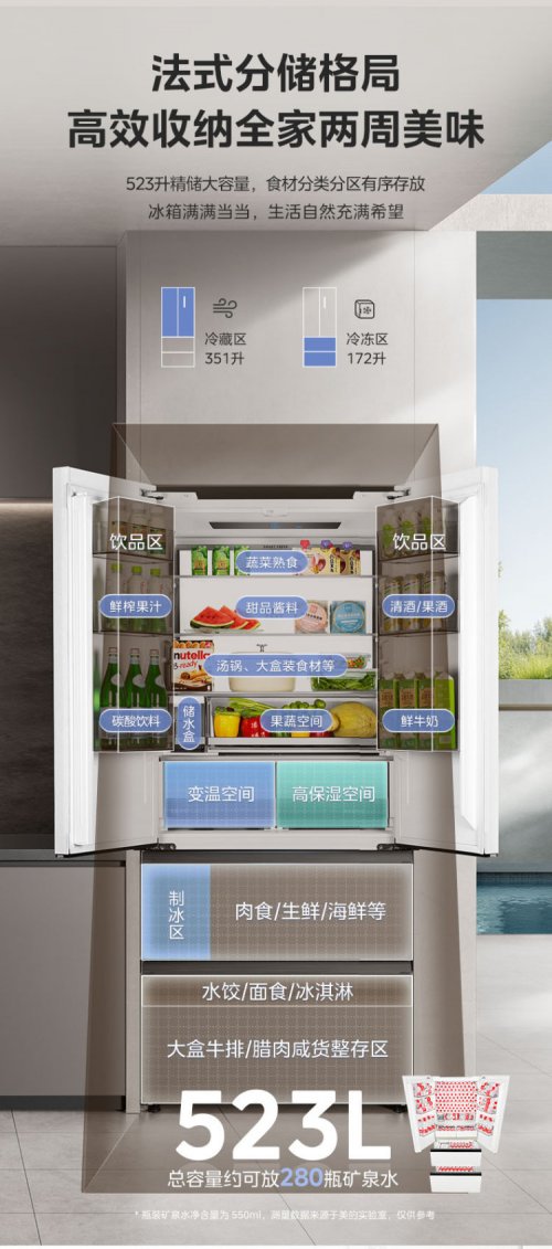 独创“左餐右厨”双模式分区,精准匹配现代家庭的精致生活需求:左边可存放鲜果、零食、气泡水,追剧时拿取无需穿梭厨房;右边收纳烹饪食材、酱料和生肉,实现干湿分离,兼顾美观与实用。16区科学分储设计贴心至极,抑菌零食抽屉采用银离子抗菌材质,宝宝辅食、精致甜点都能放心存放;独立密封制冰盒洁净卫生,轻松解锁夏日冰饮仪式感。全空间净化系统加持,冷藏PSE智能净化+冷冻PTI离子净化,三分区独立控温杜绝串味,30dB超静音运行,默默守护家居静谧氛围。427L大容量搭配8kg/12h强冷冻力,满足两口或三口之家日常囤货,一级能效日均耗电仅0.83度,长期使用更省心。