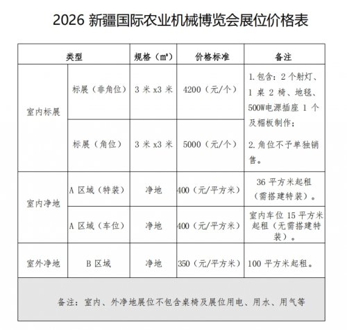 2026新疆国际农业机械博览会展位价格表