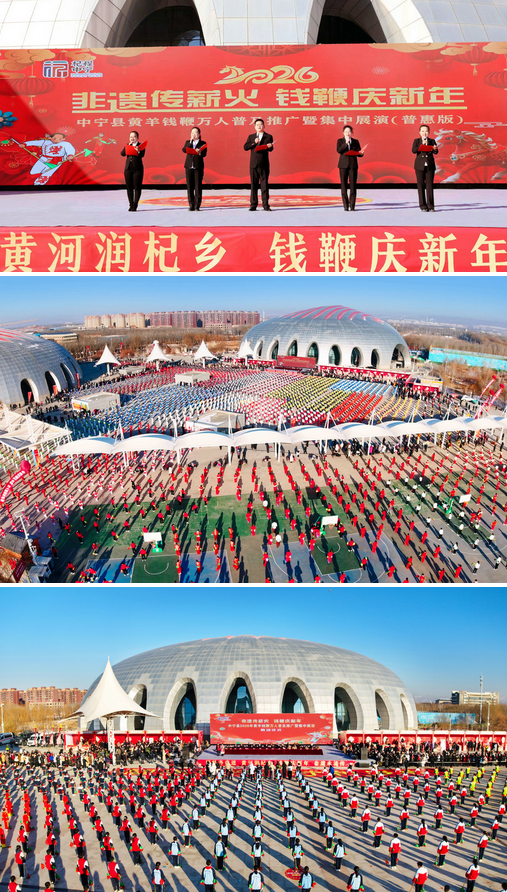 2026年1月7日至9日,由中共中宁县委员会、中宁县人民政府主办,中宁县委宣传部、中宁县文化旅游广电局承办,2026年“非遗传薪火·钱鞭庆新年”黄羊钱鞭万人推广普及暨集中展演活动在中宁县圆满举行。新年伊始的杞乡大地,钱鞭响亮,锣鼓铿锵,上演了一场万民同欢的文化盛宴。