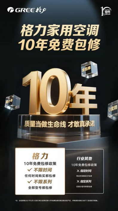 格力对“铝代铜”技术的审慎态度,与其“十年免费包修”的服务承诺紧密相关。朱磊明确指出:“拒绝‘铝代铜’,本质上是为了守住格力‘十年免费包修’的承诺底线。”