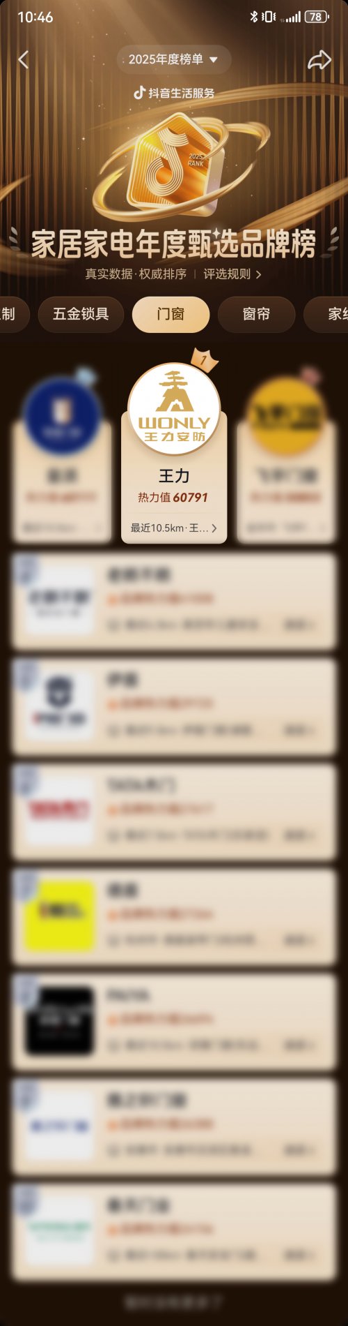 近日,抖音发布2025年度家居家电品类甄选品牌榜单,王力安防(以下简称王力)以综合评分第一的卓越表现,强势登顶门窗品类榜首。这不仅是对王力过去一年市场表现的肯定,更是用户用实际选择为王力投下的信任票。