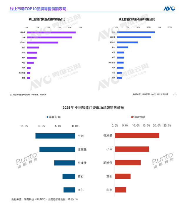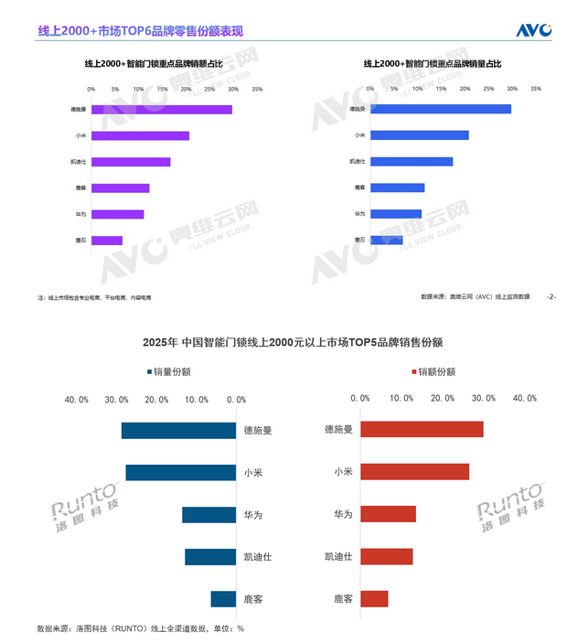 奥维云网在报告中指出,2025年,中国智能门锁行业在技术门槛提升、用户品牌认知增强等因素驱动下,市场资源加速向优势企业聚集,中长尾品牌生存空间收窄。在传统电商渠道,TOP5品牌零售量占比接近60%,TOP10品牌合计份额超过75%,头部效应愈发显著。其中,德施曼位居线上市场(含传统电商与内容电商)零售额榜首,在线上2000元及以上价格段市场中实现量额双第一,领跑高端市场。