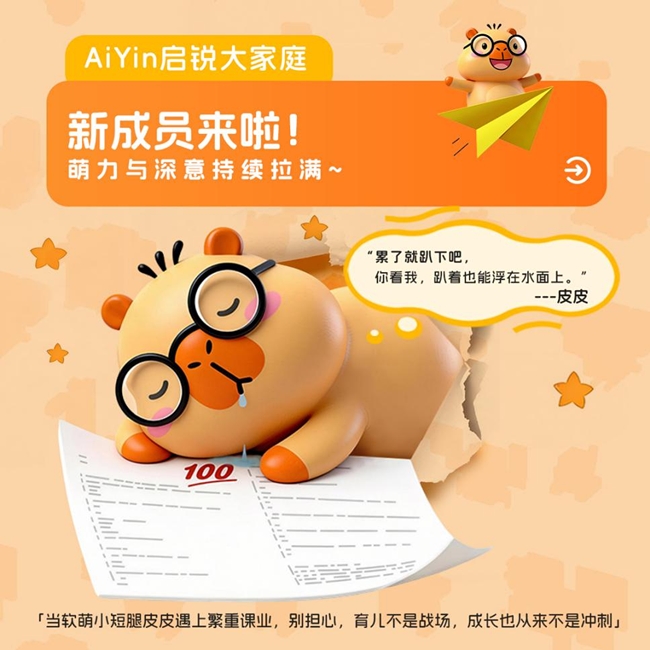“皮皮”以卡皮巴拉为原型,圆润呆萌的外形传递着“别焦虑,慢慢来”的松弛生活哲学,既契合学生群体的成长节奏,也贴合家庭场景的温馨氛围,生动诠释了AiYin启锐“将温暖注入科技,以匠心雕琢产品”的文化理念。