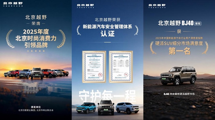 自上市以来,BJ40凭硬核产品力收获广泛认可,不仅拥有30万+用户的信赖,也实力斩获2025年度北京时尚消费力引领品牌、新能源汽车安全管理体系认证、2025年中国新能源汽车行业用户满意度指数-硬派SUV细分市场满意度第一名等殊荣,为北京越野持续创新注入核心底气。