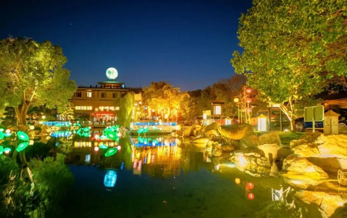 夜幕下温泉,雾气氤氲,灯笼点缀如星河