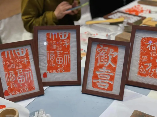 现场为来宾拓印福字,书写春联,笑待八方客。