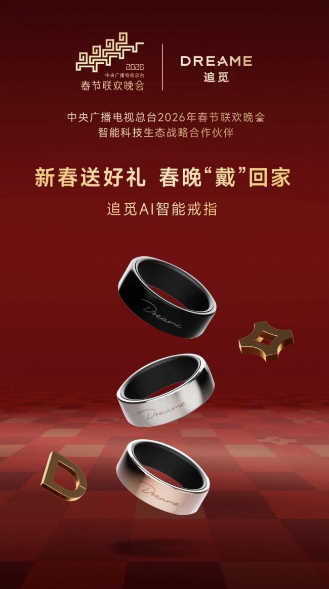 在寓意“骐骥奔腾、奋进新程”的丙午马年,中央广播电视总台官宣,追觅科技成为2026年春节联欢晚会智能科技生态战略合作伙伴。这是追觅科技携手国民级 IP,以 AI 技术赋能为核心,顺应时代发展浪潮,为全球华人打造的一场融合传统底蕴与智能新意的新春盛宴。而作为追觅科技在 AI 智能硬件领域布局的重要一环,春晚同款 AI 智能戒指也将在 AI 技术重构硬件价值生态的当下,与大众一同喜迎新春。