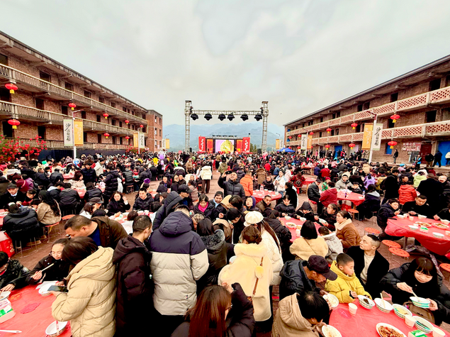 张灯结彩迎新春,千人同宴庆团圆。2月9日,四川乐山沙湾区牛石镇“骏马争先·福满家园”红房团年宴在该镇红房子影视基地举行,为当地居民和来沙游客送上了一场年味十足的新春嘉年华。