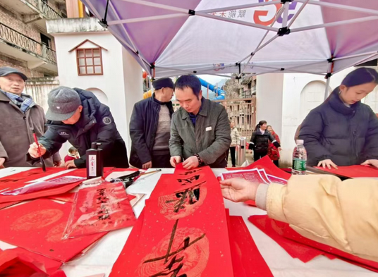 午后刚过,红房子影视基地便热闹了起来。新春打卡、手写春联、编织中国结、绘制百福图……一个个民俗互动摊位前人头攒动,居民和游客争相上前体验,新春氛围浓郁。